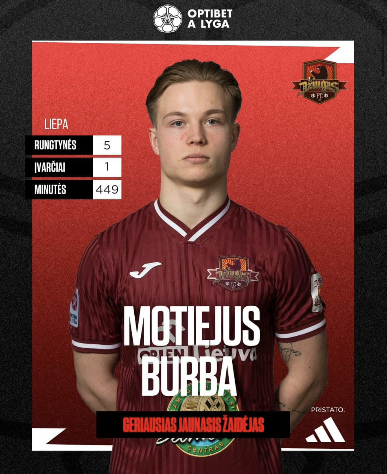 Motiejus Burba has been presented with the Young Player of the month award in the Lithuanian Premier League.